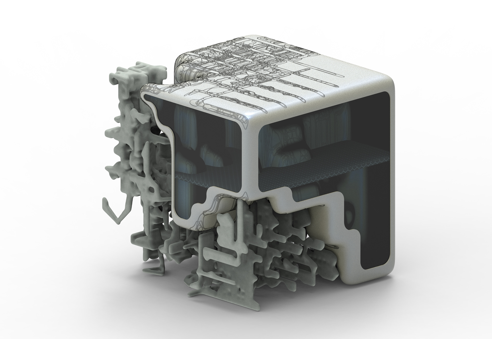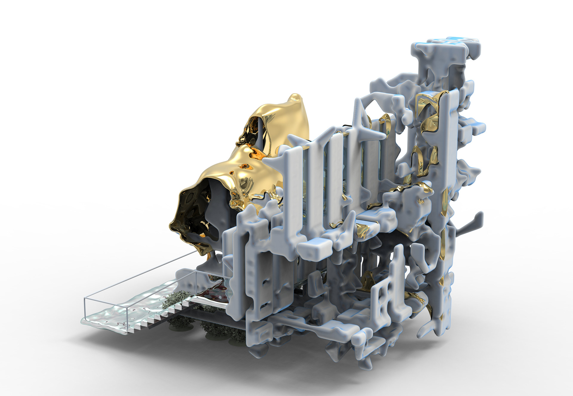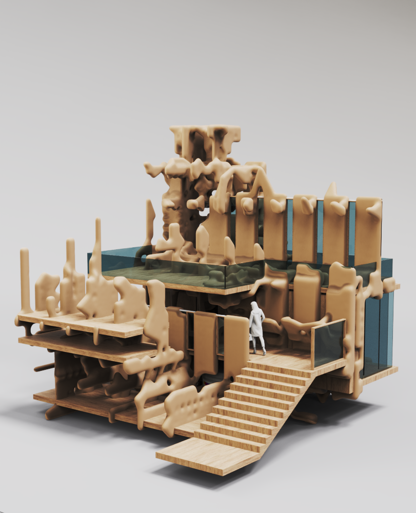 This project explores how AI-generated volumetric forms can be transformed into architectural space through a computational design process. Using a 3D Generative Adversarial Network (3D-GAN), abstract geometries were generated, curated, and reinterpreted to investigate new modes of form-making and spatial organization. The study reconsiders the role of the designer within an AI-assisted workflow, where algorithmic outcomes become the foundation for architectural imagination.