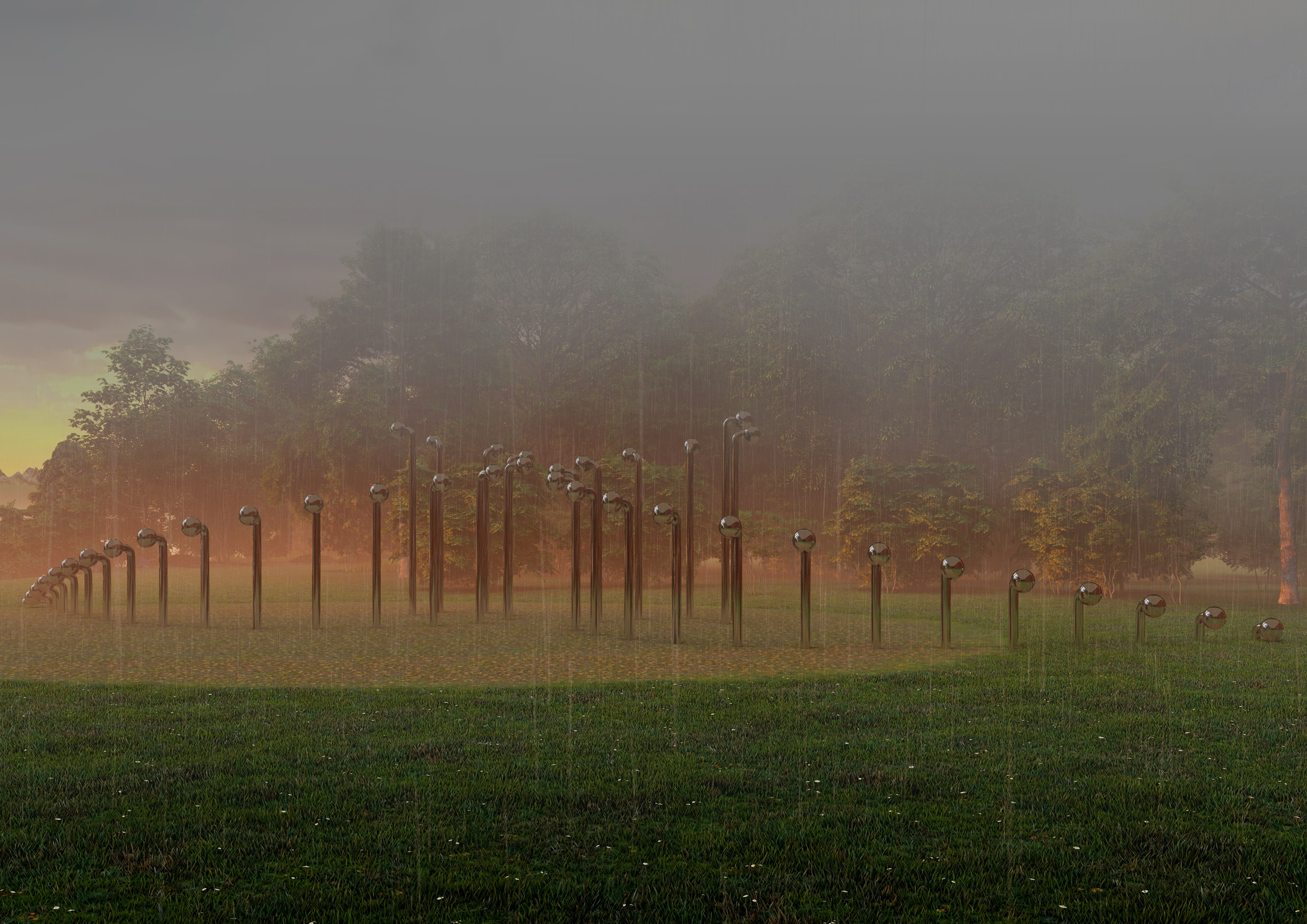 a second stage public art commission visualized for a Town Park in Ireland. The proposal was shortlisted to the nal stage of the competition. A collaboration with Sculptor Cathal Mc Carthy. Quadra is a walk through installation designed in a Fibonacci like sequence. It is composed of a series of stainless spheres that will mirror the surrounding landscape.